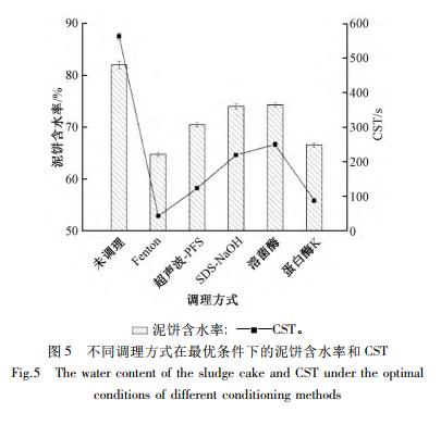 圖 5 對比了各調(diào)理方法在最優(yōu)條件下所得污泥的泥餅含水率和 CST。可知: 各調(diào)理方法能不同程度地降低污泥的泥餅含水率和 CST,提高污泥的脫水性能。Fenton 調(diào)理的效果最為突出,泥餅含水率下降17. 26 百分點,CST 下降 520. 6 s,其次依次是蛋白酶K 調(diào)理、超聲波-PFS 聯(lián)合調(diào)理、SDS-NaOH 聯(lián)合調(diào)理和溶菌酶調(diào)理。其中,SDS-NaOH 聯(lián)合調(diào)理的最優(yōu)pH 均為 3,NaOH 的協(xié)同作用反而使污泥脫水性能惡化。溶菌酶調(diào)理和蛋白酶 K 調(diào)理效果對比表明蛋白酶 K 更能促進污泥中水分的脫除,可能是由于蛋白酶 K 不僅能促進污泥中微生物細胞結(jié)構(gòu)的水解,還能水解污泥中原有的和細胞破解后釋放的有機物質(zhì)。