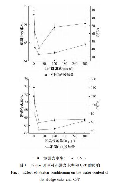 一般 認(rèn) 為 Fenton 試劑氧化的最佳 pH 為 2 ~4,本實驗中調(diào)節(jié)污泥 pH 為 3。30%H2O2 投加量為 30. 0 mg /g 時,Fe2+投加量對污泥脫水性能的影響如圖 1a 所示。隨著 Fe2+投加量的增加,泥餅含水率和 CST 均先減小后增加,Fe2+ 投加量為 30. 0 mg /g時,泥餅含水率和 CST 達到最小值,分別為 65. 4%和33. 3 s。Fe2+離子在 Fenton 反應(yīng)中作為催化劑促進·OH的產(chǎn)生,·OH 具有強氧化性,能夠破解污泥絮體、胞外聚合物( EPS) 和細胞的結(jié)構(gòu),氧化分解 EPS等有機物,促進細胞內(nèi)部水和結(jié)合水的釋放,改善污泥脫水性能。同時,Fe2+被氧化生成的 Fe3+可以通過生成磷酸鐵沉淀及 Fe3+水解聚合沉淀產(chǎn)物進一步強化污泥脫水性能。
